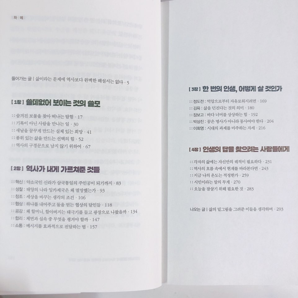 “역사는 사람을 만나는 인문학”으로, 역사 속 인물들을 통해 그들의 삶에서 어떤 통찰을 얻고 어떤 문제에 대한 답을 찾았는지 이야기를 해주고 있다. 불확실성의 시대에서 우리는 늘 불안하다. 이 시대는 어디로 가고 있는 것일까? 나는 어떻게 살아야 하는 걸까? 많은 고민들을 하게 되는데, 역사를 공부한 사람은 긍정적인 답을 할 것이고, 과거보다는 현재가 나아졌듯이 미래는 더욱 밝을 거라고, 나보다 우리의 힘을 믿고 서로 의지하며, 살아가면 된다고 저자는 말한다.