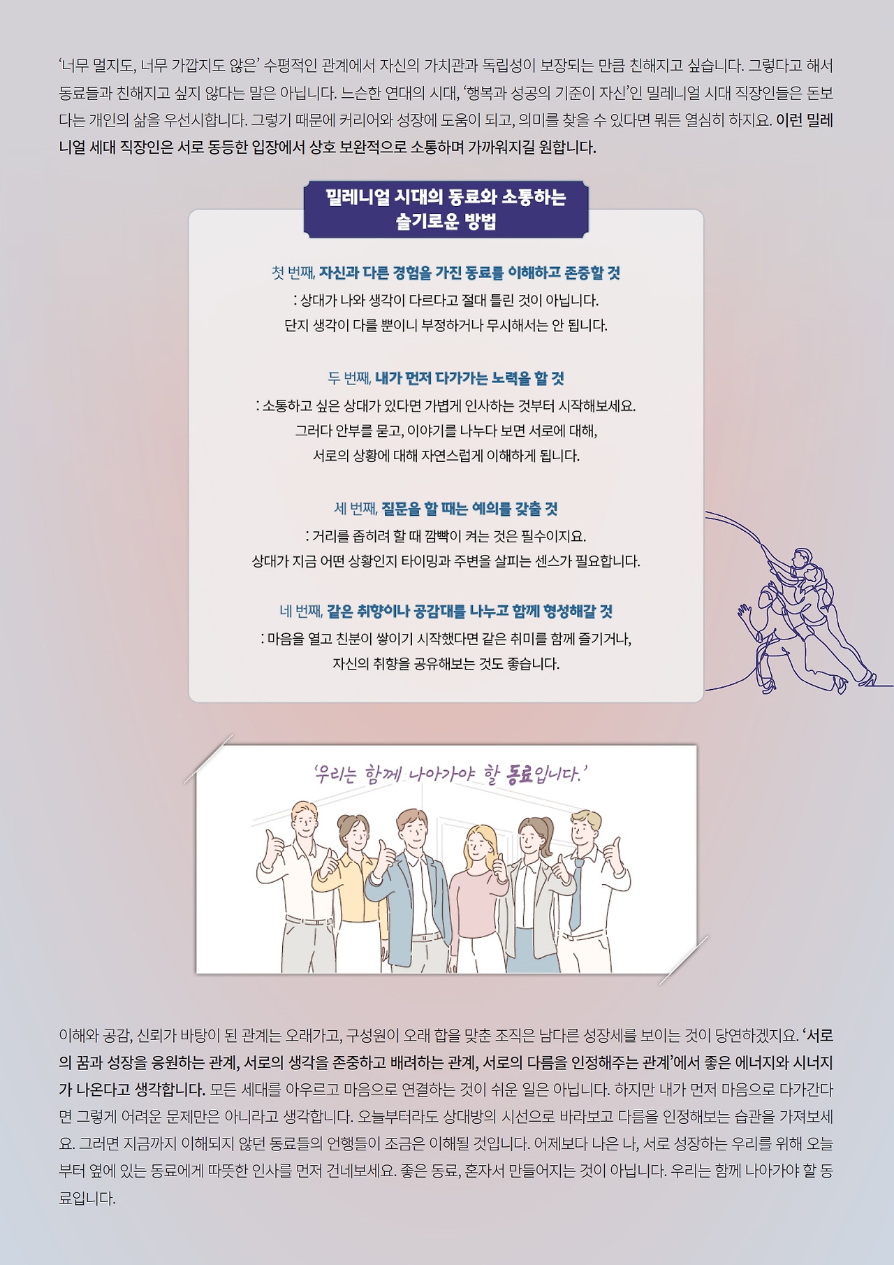 이해와 공감, 신뢰가 바탕이 된 관계는 오래가고, 구성원이 오래 합을 맞춘 조직은 남다른 성장세를 보이는 것이 당연하겠지요. ‘서로의 꿈과 성장을 응원하는 관계, 서로의 생각을 존중하고 배려하는 관계, 서로의 다름을 인정해주는 관계’에서 좋은 에너지와 시너지가 나온다고 생각합니다. 모든 세대를 아우르고 마음으로 연결하는 것이 쉬운 일은 아닙니다. 하지만 내가 먼저 마음으로 다가간다면 그렇게 어려운 문제만은 아니라고 생각합니다. 오늘부터라도 상대방의 시선으로 바라보고 다름을 인정해보는 습관을 가져보세요. 그러면 지금까지 이해되지 않던 동료들의 언행들이 조금은 이해될 것입니다. 어제보다 나은 나, 서로 성장하는 우리를 위해 오늘부터 옆에 있는 동료에게 따뜻한 인사를 먼저 건네보세요. 좋은 동료, 혼자서 만들어지는 것이 아닙니다. 우리는 함께 나아가야 할 동료입니다.