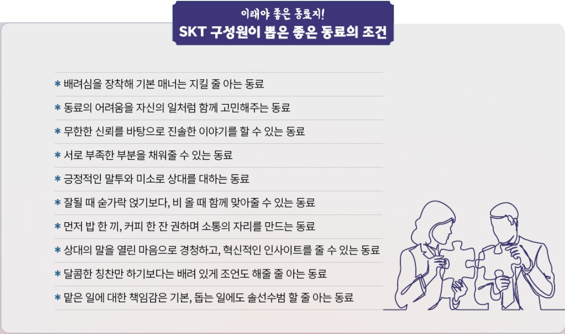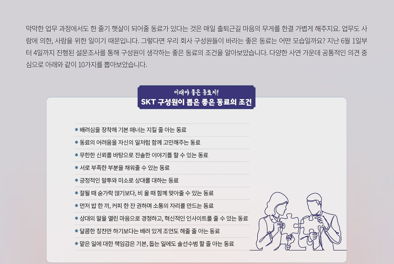 막막한 업무 과정에서도 한 줄기 햇살이 되어줄 동료가 있다는 것은 매일 출퇴근길 마음의 무게를 한결 가볍게 해주지요. 업무도 사람에 의한, 사람을 위한 일이기 때문입니다. 그렇다면 우리 회사 구성원들이 바라는 좋은 동료는 어떤 모습일까요? 지난 6월 1일부터 4일까지 진행된 설문조사를 통해 구성원이 생각하는 좋은 동료의 조건을 알아보았습니다. 다양한 사연 가운데 공통적인 의견 중심으로 아래와 같이 10가지를 뽑아보았습니다.