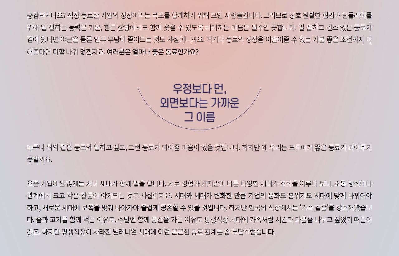 요즘 기업에선 많게는 서너 세대가 함께 일을 합니다. 서로 경험과 가치관이 다른 다양한 세대가 조직을 이루다 보니, 소통 방식이나 관계에서 크고 작은 갈등이 야기되는 것도 사실이지요. 시대와 세대가 변화한 만큼 기업의 문화도 분위기도 시대에 맞게 바뀌어야 하고, 새로운 세대에 보폭을 맞춰 나아가야 즐겁게 공존할 수 있을 것입니다. 하지만 한국의 직장에서는 ‘가족 같음’을 강조해왔습니다. 술과 고기를 함께 먹는 이유도, 주말엔 함께 등산을 가는 이유도 평생직장 시대에 가족처럼 시간과 마음을 나누고 싶었기 때문이겠죠. 하지만 평생직장이 사라진 밀레니얼 시대에 이런 끈끈한 동료 관계는 좀 부담스럽습니다.