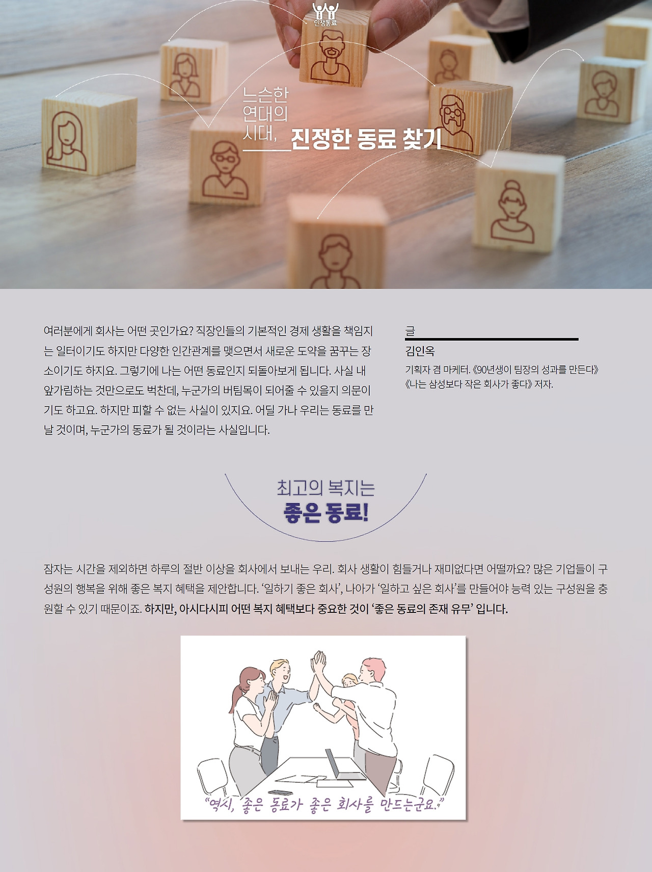 여러분에게 회사는 어떤 곳인가요? 직장인들의 기본적인 경제 생활을 책임지는 일터이기도 하지만 다양한 인간관계를 맺으면서 새로운 도약을 꿈꾸는 장소이기도 하지요. 그렇기에 나는 어떤 동료인지 되돌아보게 됩니다. 사실 내 앞가림하는 것만으로도 벅찬데, 누군가의 버팀목이 되어줄 수 있을지 의문이기도 하고요. 하지만 피할 수 없는 사실이 있지요. 어딜 가나 우리는 동료를 만날 것이며, 누군가의 동료가 될 것이라는 사실입니다.
