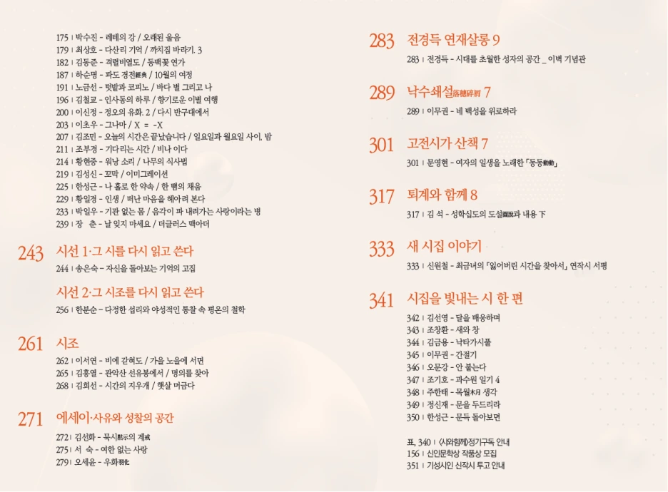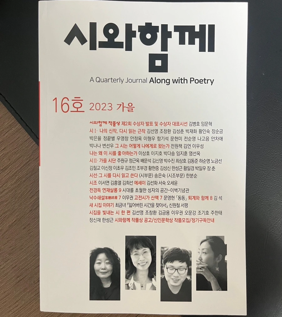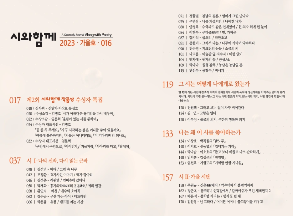 『시와함께』는 창작 중심의 계간 시문학지이다. 주의를 끄는 캐치프레이즈 대신 알맹이가 꽉 찬 내용으로 우리 시의 *위의威儀를 지키고자하는 알찬 문학잡지이다.