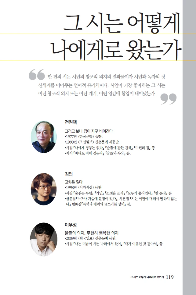 * 이 나이가 되면 그 기억의 강가에 자주 간다. 오래된 집 문을 자주 연다. 미운 사람, 그리운 사람, 때로 잊힌 사람, 잊으려 했던 사람, 마지막으로 잊힐 수밖에 없던 이까지 만난다. 반가워한다. 그들이 내게 묻는다. ‘고작 이런 시를 쓰려고 그 많은 시간을 헤맨 것인가?’ 나는 ‘그렇다’고 대답한다. 그동안 인생을 낭비했다고 고백한다. 지금으로서는 이게 내 삶의 최선이기 때문이다. 이 나이에 뭘 노래하겠는가? 눈앞에 흘러가는 울음조차 간수하지 못 하는 주제에 말이다. 삶은 원래 슬픔이다. 그러고 보니 집이 자꾸 비어간다. 방의 주인이 떠나가고 미운 정마저 잊힌다. 다시는 읽지 않아도 될 책들이 그 방에 가득하다. 인연은 이리 끝나는 것이다. 나는 마침내 그 모든 것을 사랑했노라고 고백한다.