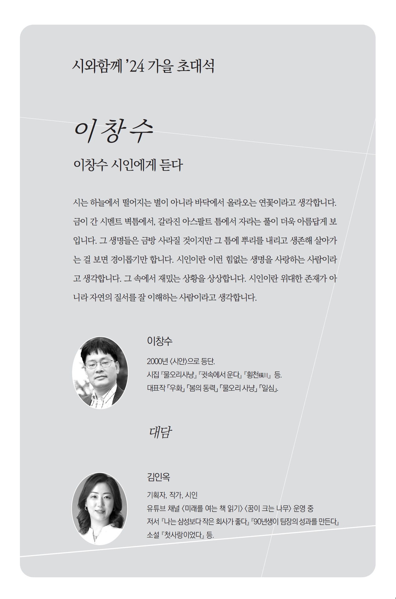 金 이창수 시인님, 독자들에게 간단히 자기소개 부탁드립니다.