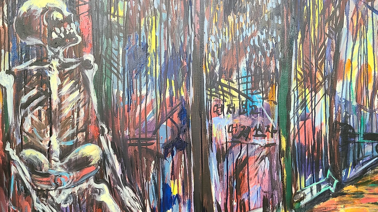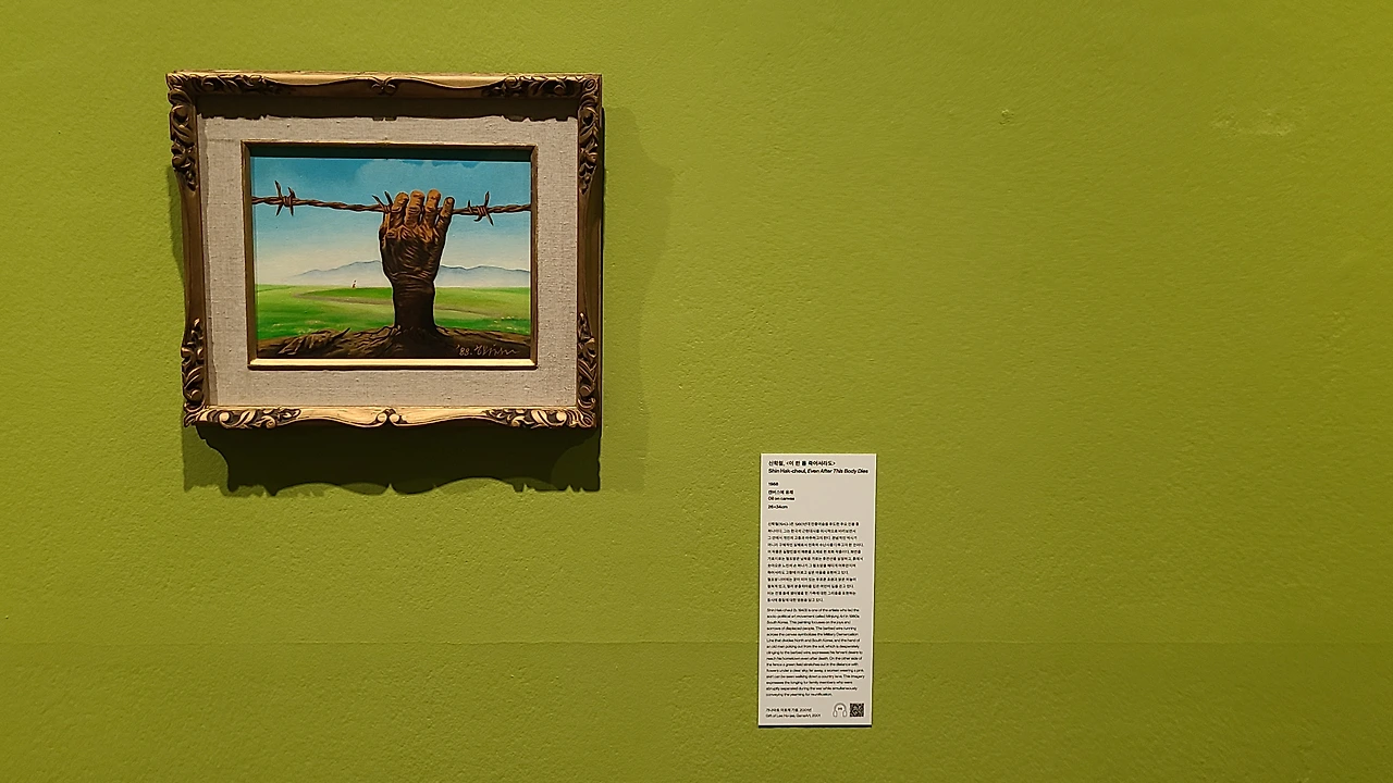 강원도 철원 백마고지의 철책선을 표현한 이 작품은 거대한 철책과 기대어 있는 해골을 통해 분단과 죽음의 이미지를 표현하였다고 한다. '먼저보고 먼저쏘자'는 표지판은 당시 치열했던 교전상황을 상징적으로 보여주는 것으로 색채가 주는 불안감에서도 전쟁 당시 죽음에 두려움과 공포도 느껴졌던 작품이다. 뭉크 작품 <절규>도 떠올랐다.