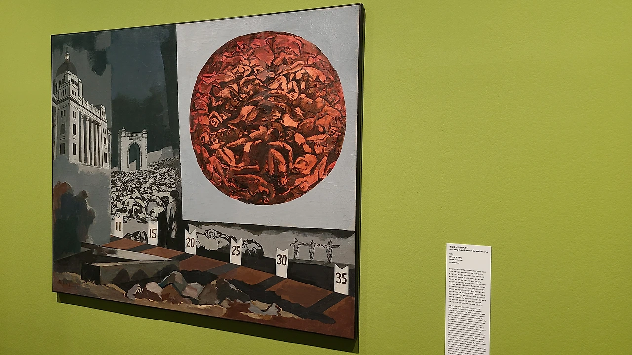 일제 식민통치를 상기시키는 조선총독부, 청나라 내정간섭을 벗어나 독립을 염원했던 독립문, 일장기를 상기시키는 핏빛 원과 순국한 애국지사들의 처참함을 시각화한 작품이라고 한다. 국립중앙박물관으로 존재했던 시절의 어렴풋한 기억이 떠올라 보게 된 작품이었다.