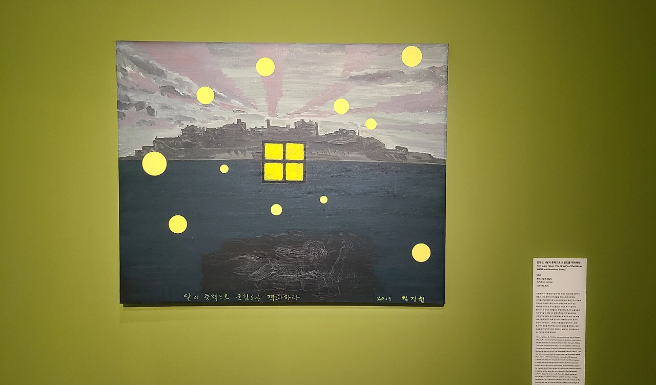 이 작품은 섬 모양이 일본 해상군함 '도사'를 닮아 '군함도'라 불리는 하시마섬에 끌려간 조선인들의 강제노동 역사를 다룬다고 한다. 화면 중앙에는 잿빛 하늘 아래 군함도가 있고, 칠흑 같은 바다 아래에는 탄광 노동자의 모습이 그려져 있다. 노란 동그라미 패턴은 군함도를 격파하는 달의 모습을 연상시킨 것으로 과거 주권 없는 삶을 다시 한번 돌아보게 하는 작가의 시각적 장치라고 한다.