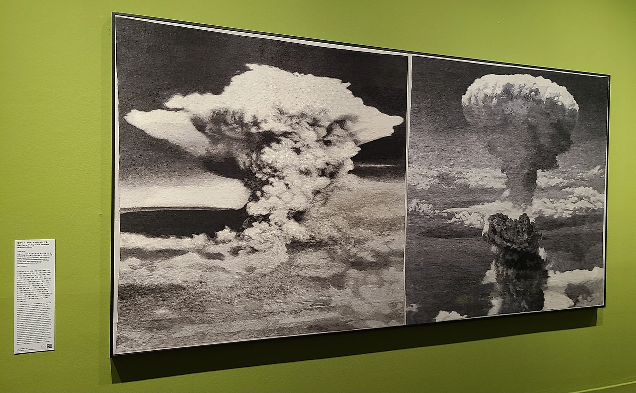 '북한자수회화'시리즈 중 하나로 2차 세계대전 당시 히로시마와 나가사키에 투하된 원자폭탄 폭발 장면을 손자수로 재현한 작품이라고 한다. 이미지 도안을 제작해 천에 인쇄한 뒤, 중국을 거쳐 북한 자수 노동자들에게 보내고 완성된 작품을 돌려받는 방식으로 작업되었다고 한다.