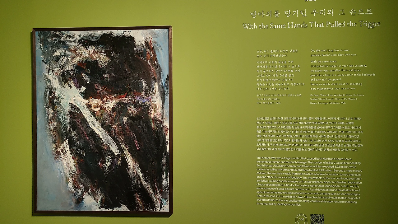 두 번째 파트는 6.25 전쟁의 참혹함과 동족상잔의 비극을 다루었는데 구상 시인의 <초토의 시. 8-적군묘지 앞에서> 부분으로 시작하며 전시되어 있었다.
