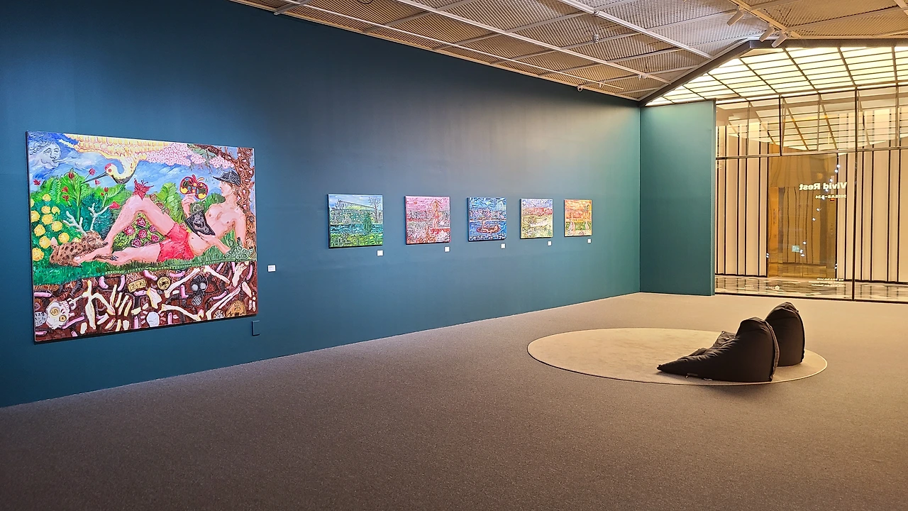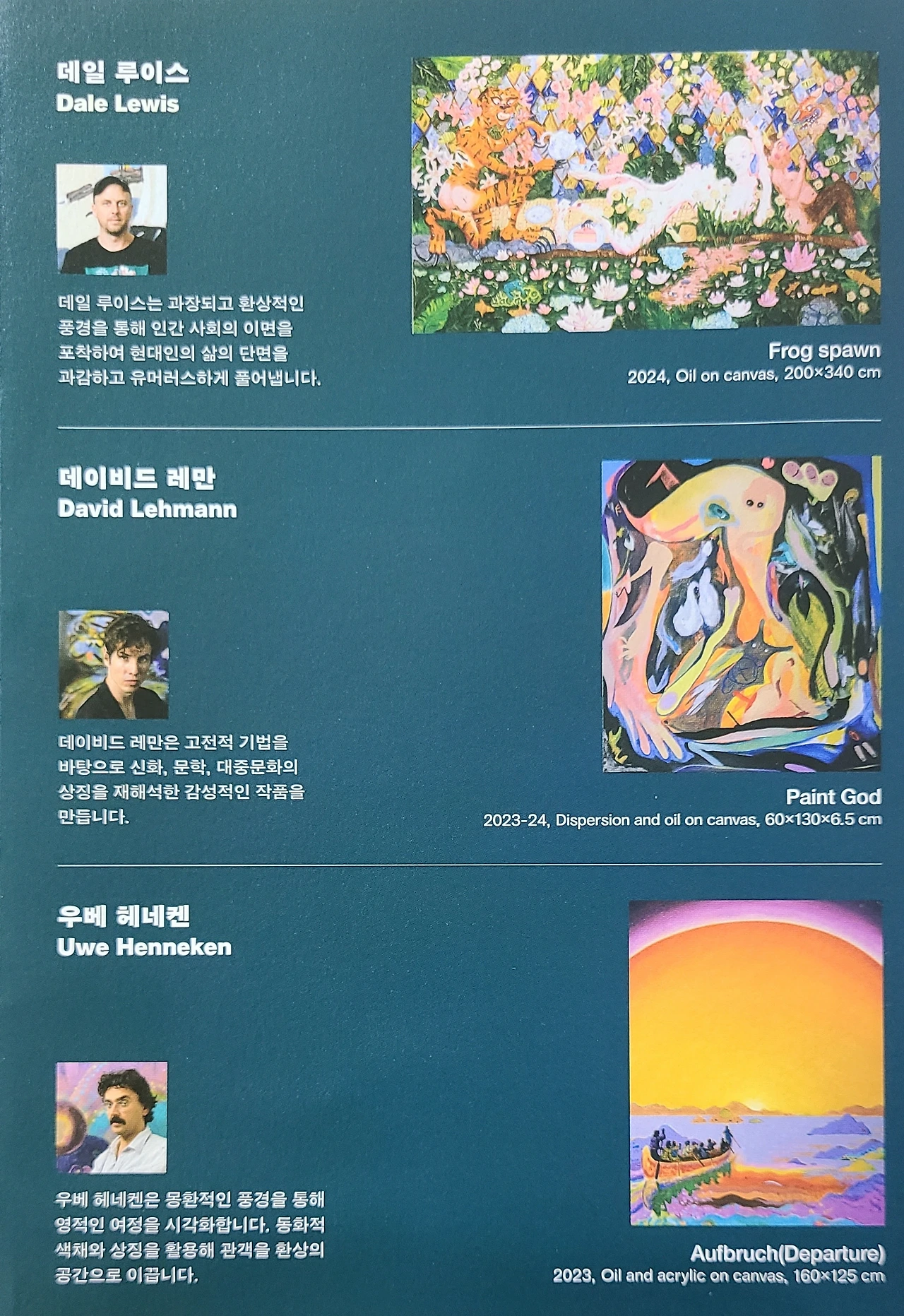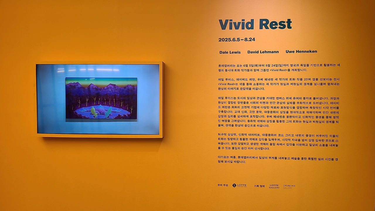 데일 루이스, 데이비드 레만, 우베 헤네켄 세 작가의 회화 작품 20여 점을 선보이는 전시 《Vivid Rest》는 색을 통해 소통하는 세 작가가 현실과 비현실의 경계를 넘나들며 펼쳐내는 환상의 이야기로 관람객을 이끕니다.