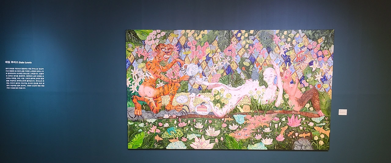 영국 런던을 기반으로 활동하는 데일 루이스는 일상적이고 평범한 도시인의 삶을 거대한 스케일의 캔버스 위에 풍자적이며 서사적인 방식으로 그려낸다. 전통적인 프리즈 양식을 응용하여 현대인의 삶의 단면을 보여주는 지하철, 거리, 시장, 그리고 음주와 소비의 풍경들을 과감하고 유머러스하게 풀어낸다. 루이스의 회화는 우리가 놓치고 지나가는 도시의 군상을 마치 한 편의 극장처럼 펼쳐 보이며, 사회와 인간에 대한 애정 어린 시선을 담고 있다.