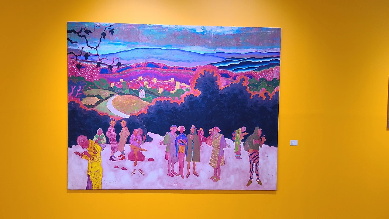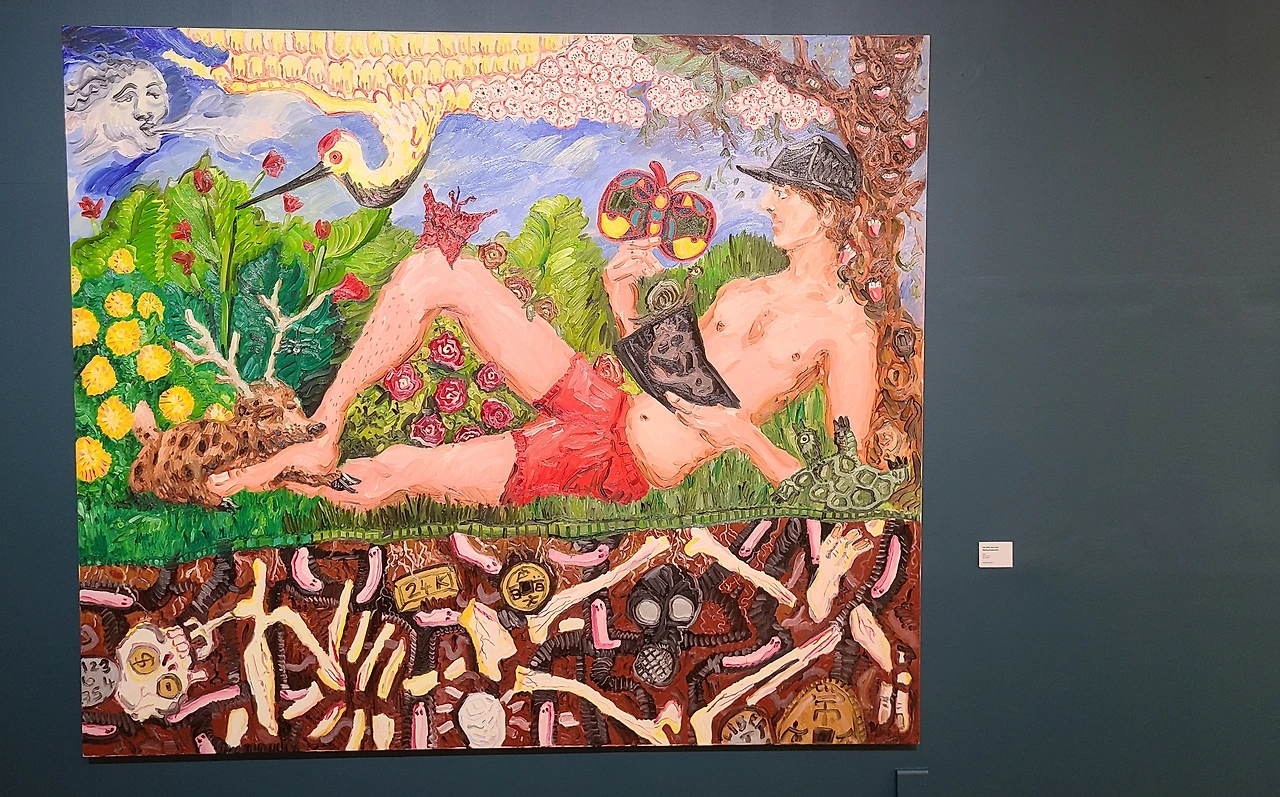 전시장에 들어서면 바로 보이는 이 작품은 우선 크기에 압도당한다. 그림 중앙에 상상 속 세상에서 편안히 누워 여가를 즐기는 사람이 보인다.