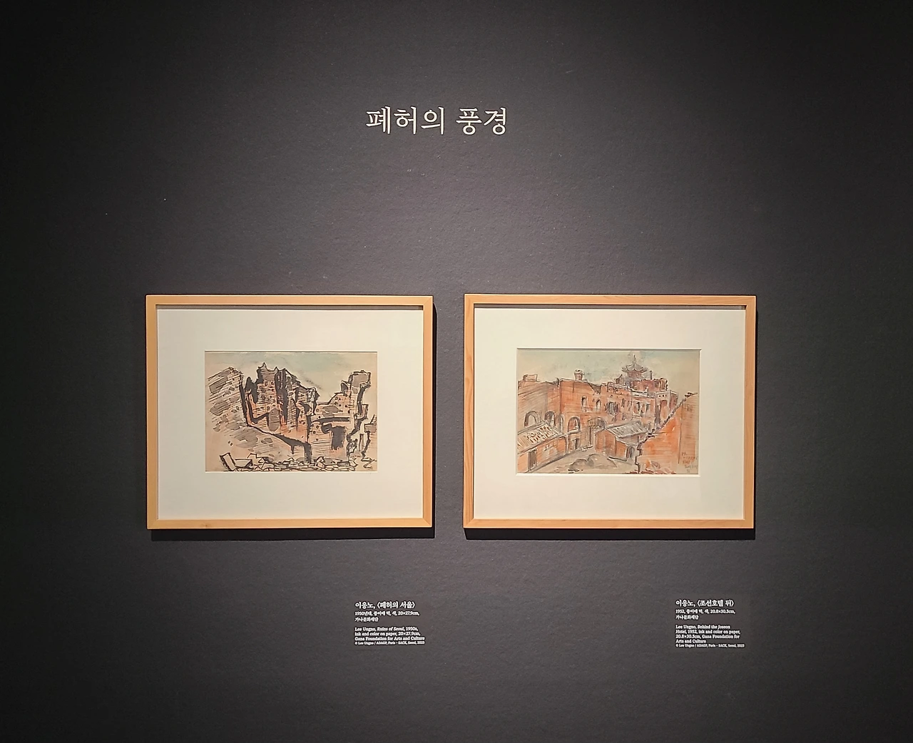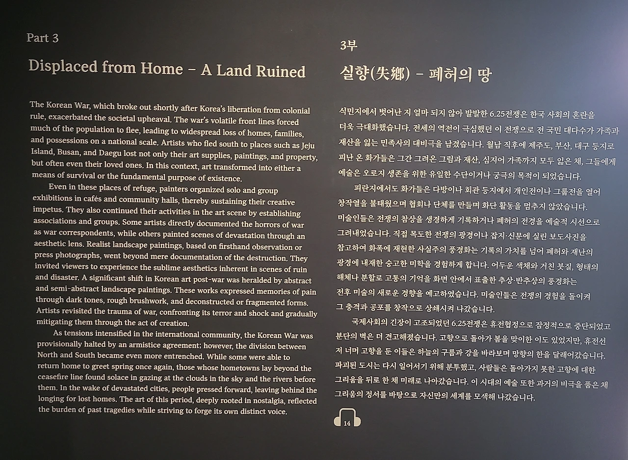 미술인들은 전쟁의 참상을 생경하게 기록하거나 폐허의 전경을 예술적 시선으로 그려내었다. 직접 목도한 전쟁의 광경이나 신문에 실린 보도사진을 참고하여 화폭에 재현한 사실주의 풍경화는 기록의 가치를 넘어 폐허와 재난의 내재한 숭고한 미학을 경험하게 한다. 어두운 색채와 거친 붓질, 형태의 해체나 분할로 고통의 기억을 화면 안에서 표출한 추상. 반추상의 풍경화는 전후 미술의 새로운 경향을 예고하였다. 이 시대의 예술 또한 과거의 비극을 품은 채 그리움의 정서를 바탕으로 자신만의 세계를 모색해 나갔다.