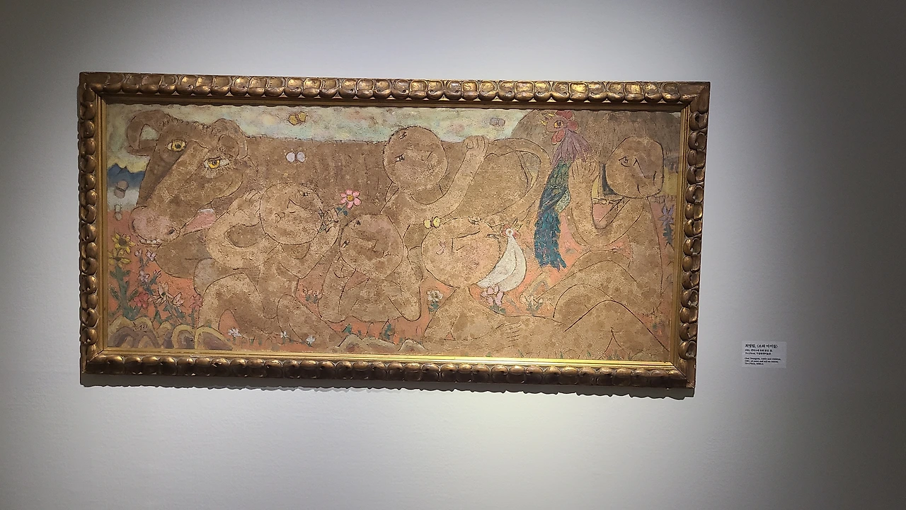 <낙원>은 황토색 톤으로 흙과 땅을 연상시키며, 벌거벗은 인물들의 피부도 흙 질감처럼 표현해 흙에서 태어나 흙으로 돌아가는 존재임을 드러낸다. 화면 곳곳의 파랑, 초록, 노랑, 주황 색채가 생명력과 생동감을 더한다. <소와 아이들>은 긴 화면에 누련 소와 아이들, 닭, 나비가 어우러져 노는 모습을 그렸다. 소는 농경 사회의 동반자이자 가족 같은 존재로, 순수한 아이들과 자연의 교감이 고향에 대한 그리움과 향수를 자아낸다.