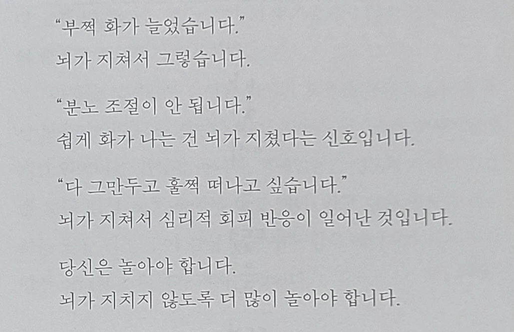 이럴 땐 하고 싶은 것을 해야 한다고 한다. 내가 가고 싶은 곳에 가고, 하고 싶은 일을 하고, 만나고 싶은 사람을 만나면 분노가 줄어든다고 이 책은 말해준다.