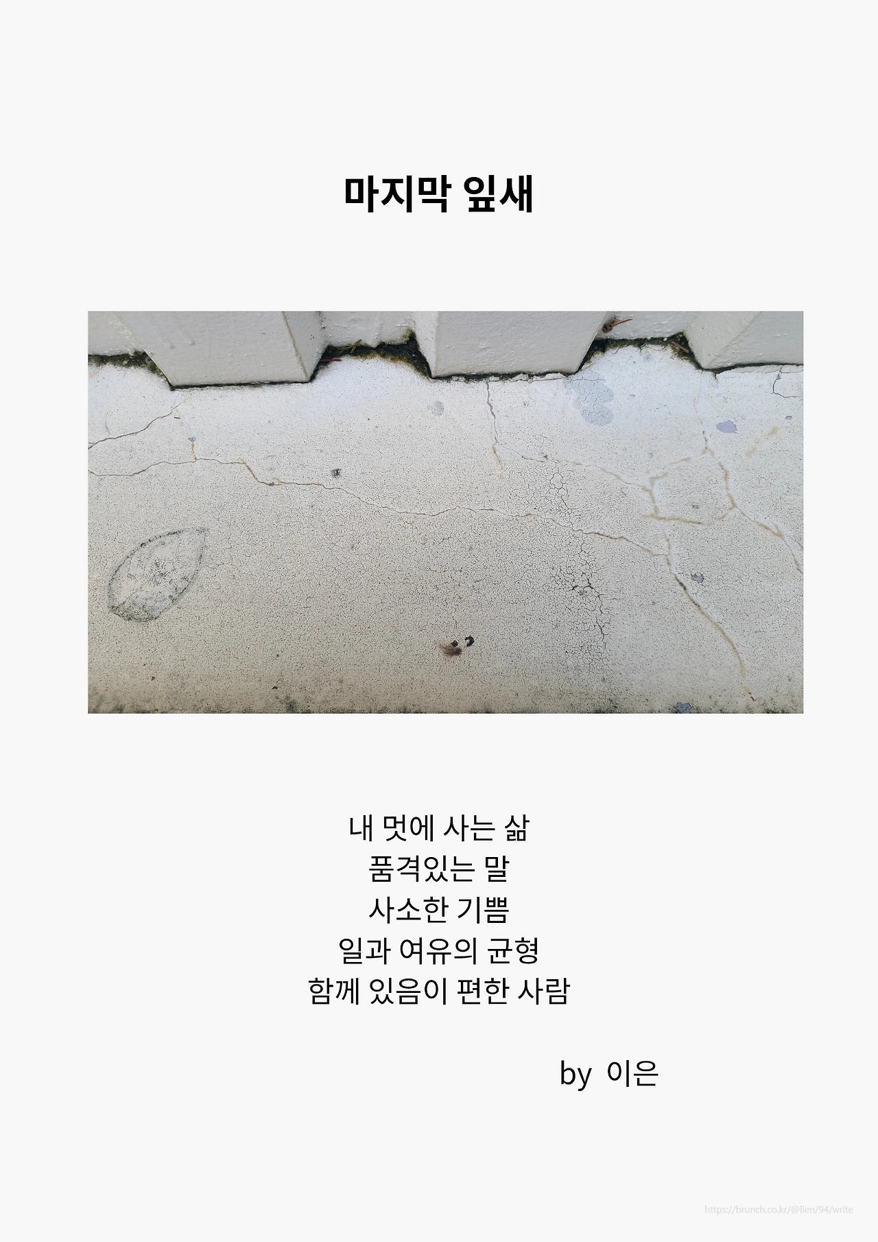 건물 벽과 난간 사이를 이어주는 작은 바닥에 나뭇잎 화석을 발견하는 순간이었습니다. 갈라진 틈이 나무의 기둥과 가지를 만들고 하나 남은 나뭇잎이 떨어지는 순간의 그림과도 같은 모습,