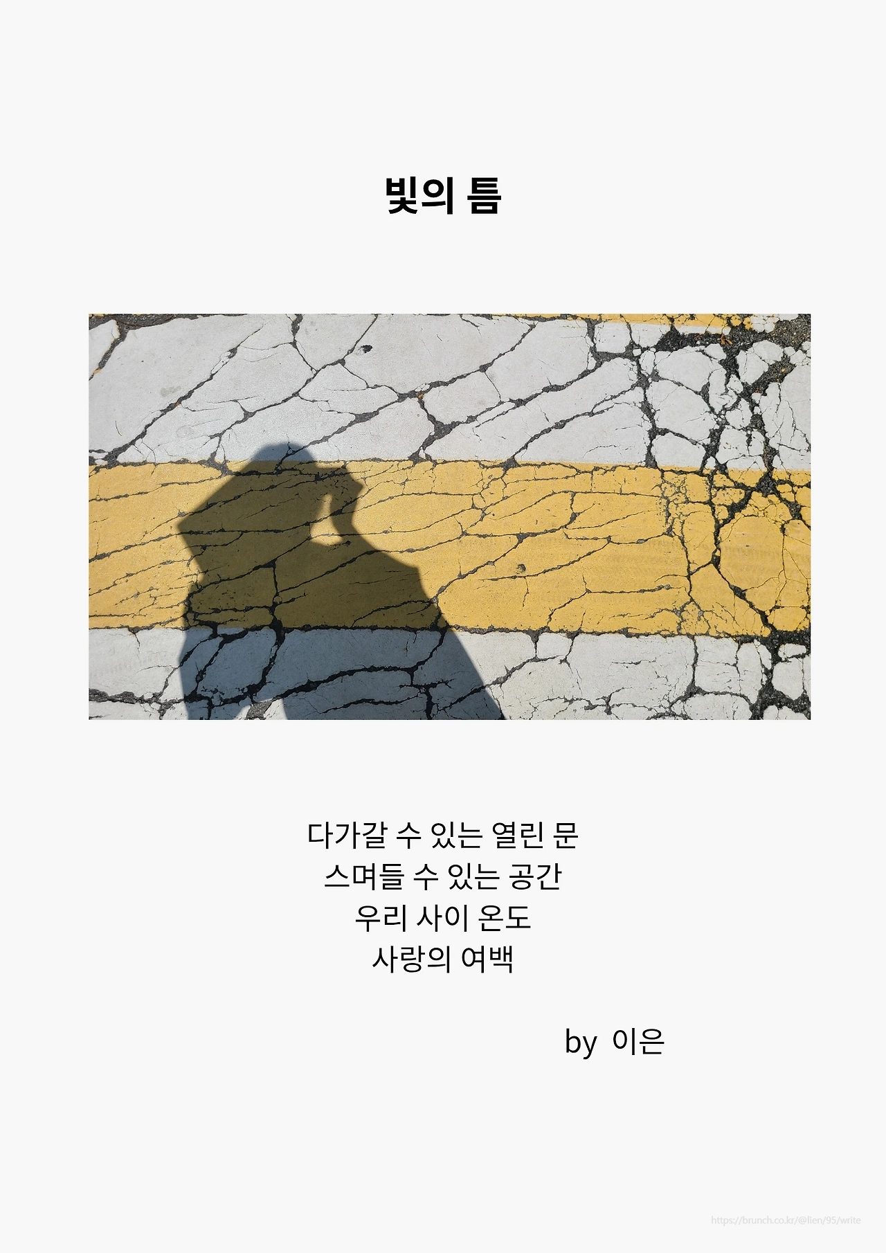 갈라진 아스팔트의 균열 위에 그림자로 비친 내 모습이 포개진 순간, 조금의 틈도 보이고 싶지 않아 숨 쉴 틈 없이 빽빽하게 살아온 나를 만났습니다.