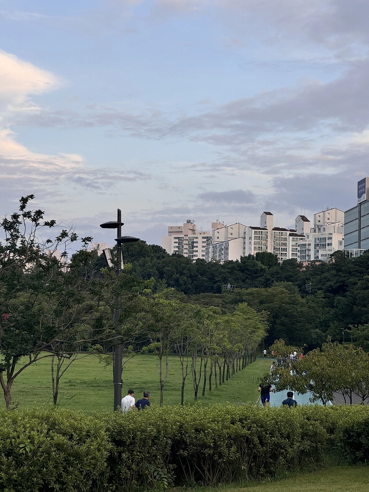 나도 오늘 하루를 시작하기 위해 집으로 돌아가야 하는데 여러 번 뒤를 돌아서 사진을 찍는다. 여전히 조깅을 하고 있는 사람들이 있고, 아니 밝아지니 사람들이 더 많아졌다. 초록빛의 잔디와 하늘의 조화가 이뻐서 더 보게 된다. 한 시간을 연이어 걷다가 집으로 돌아가려니 이제야 다리가 좀 후들거리는 것 같았다. 근데 이 뿌듯함과 개운함을 놓치고 싶지가 않았다. 조금 더 길에 산책시간을 즐겼지만 아쉬움을 뒤로하고 나의 하루를 시작하러 가본다.