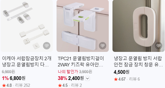 이런 참사를 막고 싶으면 '문 열림 방지', '키즈락' 키워드로 자신의 집에 맞는 제품을 찾아보자. 저렴해서 한 번에 많이 구입하는 분들이 계시니, 당근마켓에서 찾는 것도 추천한다. 나는 러브포베이비 제품을 5개에 1만 원 주고 당근 했다. 모든 문을 막으면 부엌 쓰는 게 불편해서, 칼이나 유리 제품 등 위험한 물건이 있는 곳만 막았다.
