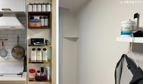 아이 손에 닿지 않았으면 하는 것은 선반으로 높은 곳에 수납하면, 아이들이 집 안을 누벼도 신경 쓰이지 않아서 좋다.