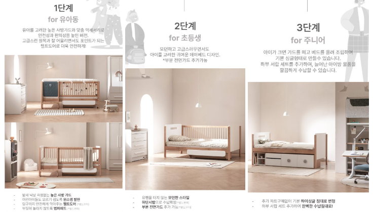 마음에 꼭 드는 아기 전용 가구가 있는 게 아니라면, 어른이 되어도 쓸 수 있는 가구를 추천한다. 아이가 자라서 어떤 취향을 가져도 대응하기 쉽도록 심플한 디자인의 모노톤/우드 가구를 추천한다. 패브릭이나 소품으로 색감과 디자인을 더하기 쉬워진다.