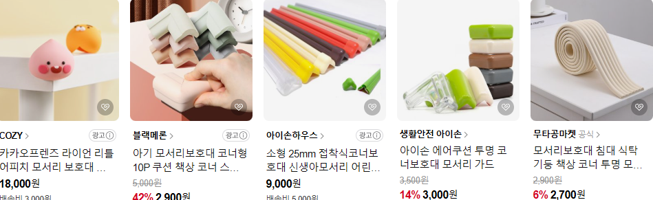 가구 모서리에 아이가 부딪치면 피부가 찢어지기 쉽다. 위험해 보이는 곳은 코너형, 직선형 보호대를 붙여 위험을 줄이는 게 좋다.