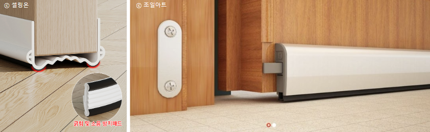 나는 네이버 쇼핑에서 설치와 세척이 쉬워 보이는 4,000원짜리 제품을 쓰고 있다. 몇 개월 쓰니 먼지가 엄청 쌓이지만, 물로 쉽게 제거할 수 있다. 먼지 쓸리는 것을 줄이고 싶다면 문을 완전히 닫았을 때만 틈을 막는 제품도 괜찮아 보인다. 후자는 아직 써보진 못했다.