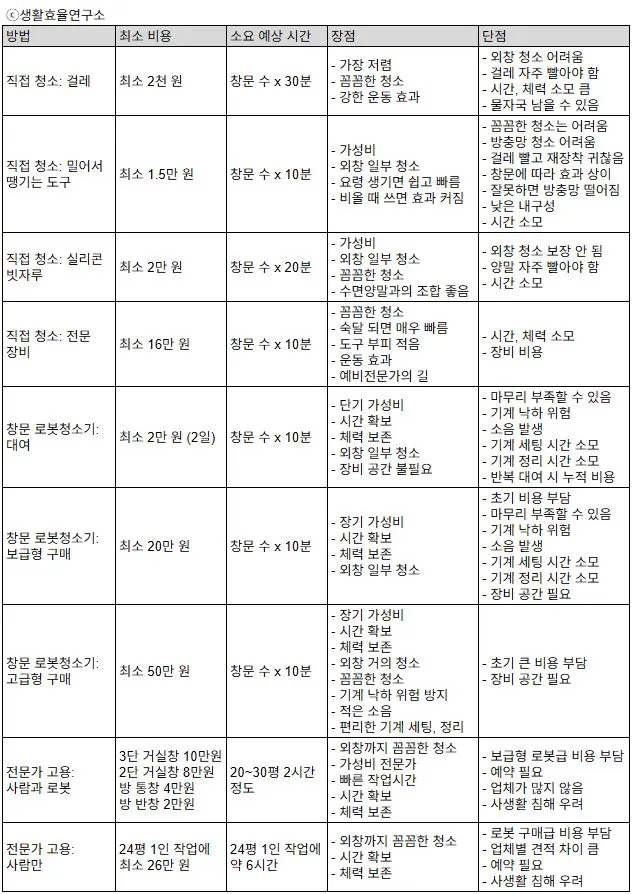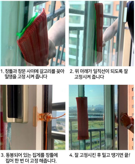 창틀과 창문 사이에 고정한 뒤, 창문을 밀고 당기면 오염을 제거해 주는 도구로 직접 청소한다. 나는 리뷰를 '평점 낮은 순'으로 보면 나오는 단점에, 우리 집에 안 맞을까 봐 시도해보진 않았다. 좋은 후기도 많으니 직접 보고 판단하자.