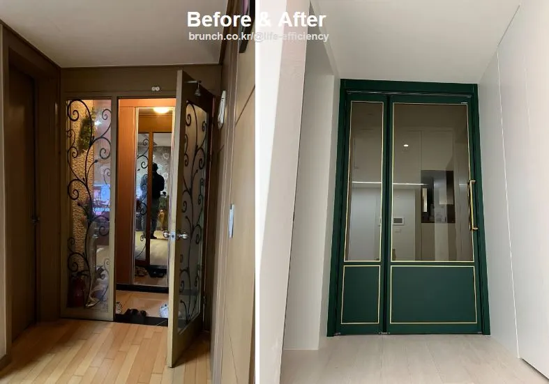 벽이 온통 흰색이라 그린+골드 조합을 골랐는데 예쁘다. 시공기사님이 고객의 80~90%가 흰 중문을 설치한다고 하셨다. 남편이 너무 흰색만 있으면 정신병원 같으니 컬러 넣자고 해서 녹색 골랐는데 만족한다. 현관에 오갈 때마다 싱그러운 녹색에 기분이 좋다.