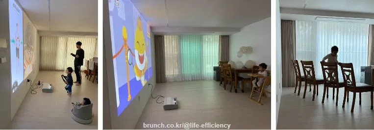 패브릭 벽지라 화면이 롤 스크린만큼 선명하다. 집이 영화관 같다. 아직 아이들이 어려 영상물 노출을 자제하고 있는데, 나중에 함께 즐길 수 있길 기대한다. 지금은 거실을 마당처럼 쓰고 있다. 1층이라 뛰놀기도 좋다.