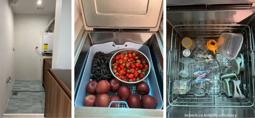 보조주방엔 초음파 식기 세척기를 설치했다. 부엌이 작아 하부장에 식기세척기 넣을 자리가 없고, 위에 올리자니 눈에 너무 띄는 게 싫었다. 초음파 식세기는 비싼데 후기가 많지 않아 도박하는 심정으로 질렀다. 써보니 우리 집 생활 패턴엔 딱 좋다. 식기세척은 기본에 과일, 야채, 젖병 소독까지 다 해준다.