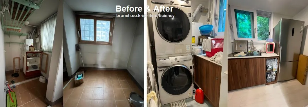 다용도실은 반은 세탁실, 반은 보조주방이다. 배수, 하수관 설비를 추가하고, 바닥은 반만 난방을 확장해서 보조주방을 만들었다. 다용도실에 마루가 있으니 물 쓸 때 신발 신지 않아도 돼서 편하다.