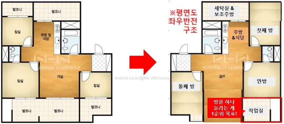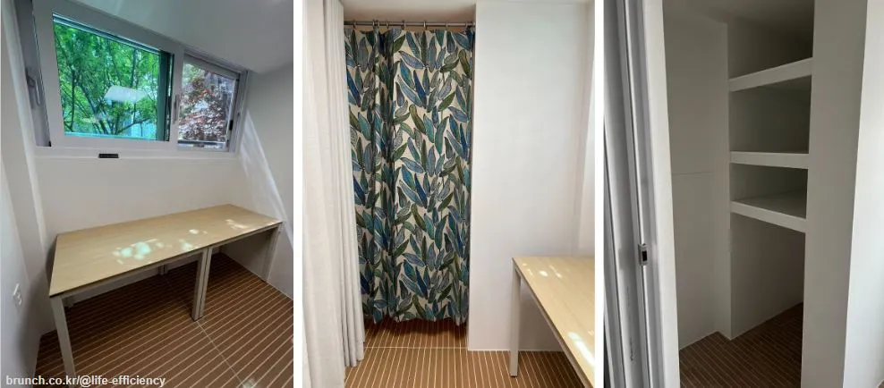 우리 집은 게임 개발자 부부와 아이 둘이 있는 4인 가구다. 인테리어 목표는 방 3개짜리 아파트를 방4개처럼 쓰는 것. 그래서 부부방, 아이방2개, 작업실을 분리하길 바랐다.