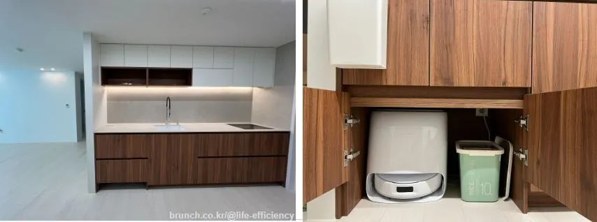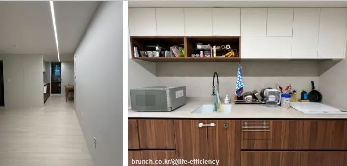 원래 인테리어에 관심이 있어 기회가 되면 해봐야지~ 하던 것들이 있다. 무몰딩, 광폭 마루, 1200각 타일, 라인 조명, IoT 조명, 인조대리석이 아닌 싱크대 상판, 직배수 로봇청소기를 넣을 싱크대 하부장, 다용도실 보조주방의 초음파 식기 세척기, 외투를 넣을 수 있는 현관 수납장.