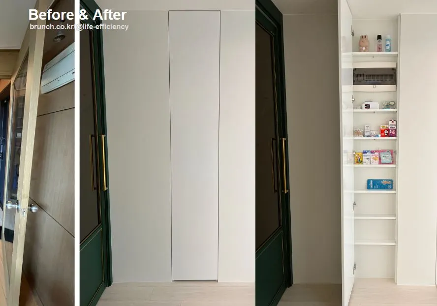 현관 앞 분전함은 인테리어 소장님의 조언으로 가렸다. 분전함 주변을 철거하니 위아래를 스티로폼으로 채워놨었다. 이걸 빼고 목공으로 틀을 잡고 목공으로 틀을 잡고, 가구 할 때 문과 선반을 달았다. 깊이 7cm의 얕은 공간이라 약을 수납했다. 한눈에 볼 수 있어 편하다.