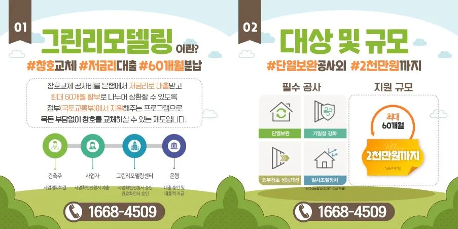 국토교통부의 민간건축물 그린리모델링 이자지원 사업은 5년, 서울특별시의 건물에너지효율화 (BRP) 융자지원 사업은 8년의 무이자 대출을 해준다. 조건은 민간건축물에 에너지 성능개선 공사를 하는 것이다. 창호를 교체하고 싶지만 현금 흐름이 걱정이라면 지원사업에 문의해 보자.