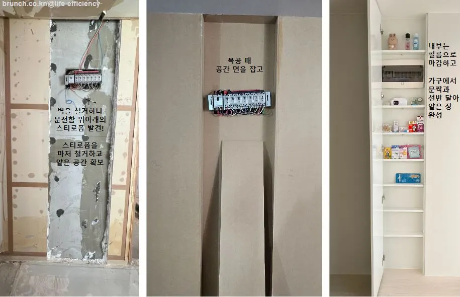 틈새공간을 발견했다면, 목공에서 벽체를 세우고 가구에서 문과 선반을 달아 수납공간을 만들 수 있다. 나는 가로 41cm, 깊이 7cm의 얕은 공간을 수납장으로 만들어 얕은 장을 만들었다. 자잘한 물건이 한눈에 보여 생각보다 유용하다.