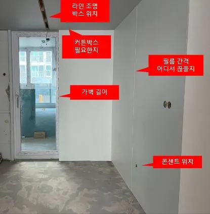 커튼박스를 만든다면 목공 전에 길이와 너비를 정해둬야 한다. 커튼박스를 어떻게 만드느냐에 따라 커튼과 블라인드의 심미적 효과가 달라지니 미리 알아두면 좋다. 100% 암막효과를 원하는 공간은 구조에 따라 가벽을 세워야할 수도 있다.