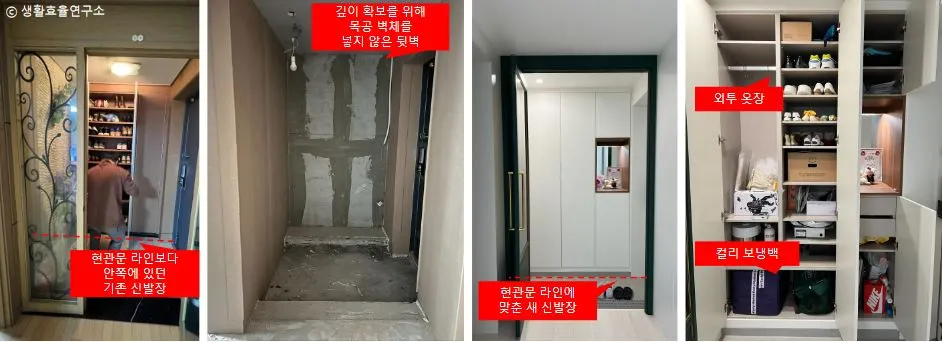 구조상 가능하다면 기존 붙박이 가구 공간을 더 넓힐 수도 있다. 목공팀에 '벽체를 세우지 않아도 가구에서 살릴 수 있는 공간일지' 물어보자. 목공 벽체비용도 아끼고 공간도 넓게 쓸 수 있어 1석 2조다. 나는 신발장을 바꿀 때 ① 뒷벽 벽체를 세우지 않아 목재 두께만큼 공간을 확보했고 ② 구조상 가능한 만큼 앞쪽 공간도 확보했다. 그 결과, 장의 깊이를 36cm에서 51cm로 15cm 늘릴 수 있었다.