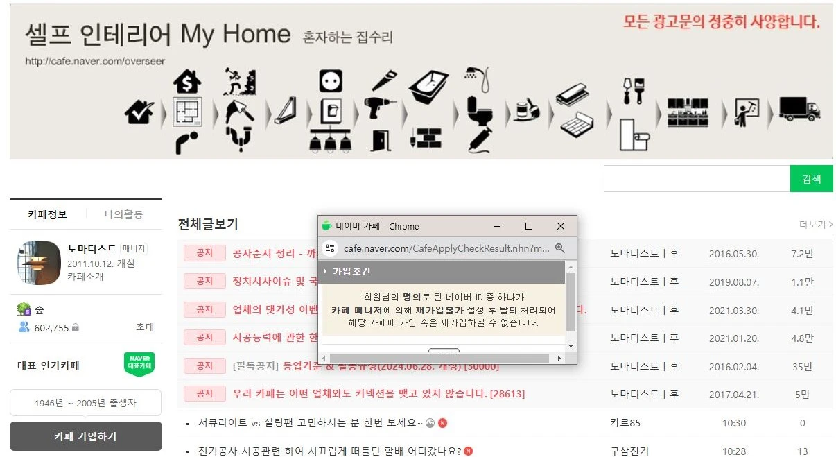 오... 인생 처음으로 네이버 카페에서 재가입 불가 탈퇴 당했다. 신기하고 황당하다. 지난주에 올린 『반셀프 인테리어 연구 15. 도어록·인터폰』게시글에 시공 업체를 소개했더니 대가성 홍보글로 신고당한 것 같다. 업체 정보 쪽지로 주고받지 말고 차라리 공개하라는 활동규정을 본 것 같아 올린 글인데, 내가 착각했나 보다. 지금은 탈퇴당해서 활동 규정을 다시 볼 수 없다.