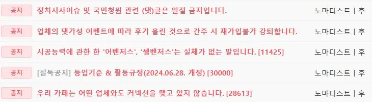 공지에 '후기 올린 것으로 간주 시'라는 말이 당해 보니 상당한 권력이다. 매니저가 '보기에' 광고성이면 회원이 소명할 여지도 없이 다시는 가입할 수 없게 만들 수 있다.