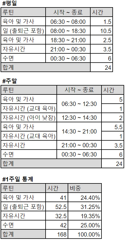 싱글일 때, 부부만 있을 때도 수면과 일하는 시간은 같았다. 평일 저녁 준비 및 먹는 시간, 주말 식사 및 기본 가사노동시간을 어림잡으면 20시간 정도였을 거다. 아이를 낳고 오롯이 아이를 위해 쓰는 시간은 1주에 20시간 정도인 것 같다. 이 시간도 아이와 함께 장을 보거나 책 도서관, 장난감 도서관, 카페에 가는 등 부모도 함께 즐길 수 있는 시간으로 쓰고 있어서, 육아가 수월하다고 느낀다.