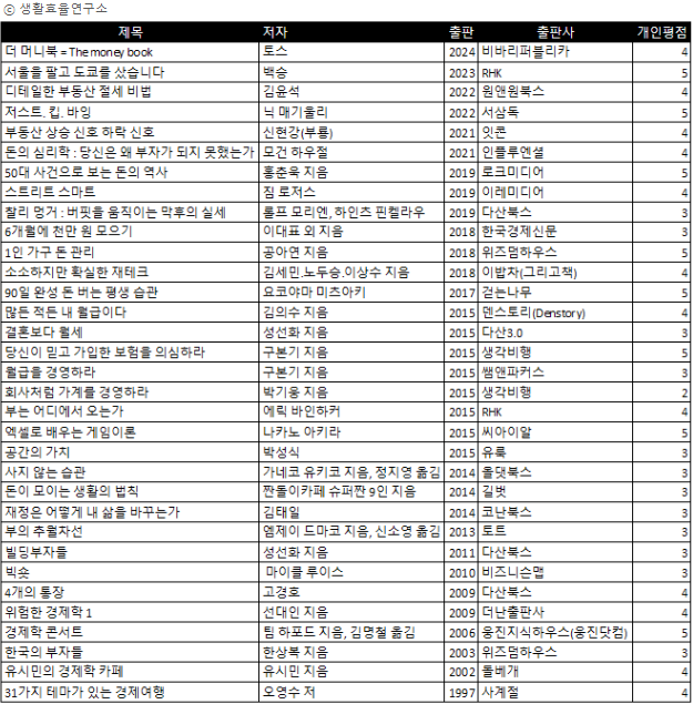 난 『인생이 빛나는 정리의 마법』, 『사지 않는 습관』, 『그리고 생활은 계속된다』등 미니멀하게 사는 저자들에게 이 책에서 말하는 습관을 배웠다. 하지만 생활재무 책을 한 권 고르라면 이 책이다. 핵심만 읽기 쉽게 정리해서 좋다. '덜 쓰기' 같이 욕망을 억압하는 규칙보다 일단 생활을 돌아보자는 방향에도 공감한다.