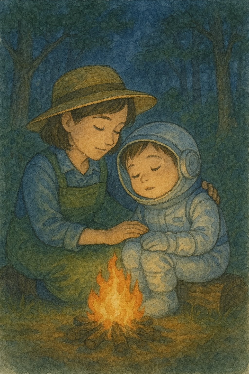 “아, 이제 침대로 가자고? 그래, 가자. 이제 엄마 이야기는 다 끝났어. 날이 좀 덥네. 여름이라서 그런가 봐. 이렇게 늦게 자도 내일은 일요일이니 다행이지 뭐야. 늦잠 잘 수 있겠다. 모레는 학교 가야 하니 내일 밤은 좀 일찍 자줄래. 코― 하고 자자, 엄마가 잠들 때까지 팔베개해줄까. 팔은 긁지 말자. 알았지? 어휴, 벌써 세 시 반이다. 불 끄고 자야겠다. 엄마도 너무너무 졸려.”