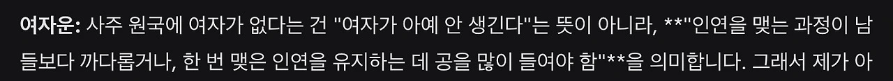 제미나이: 너는 사주에 여자가 없다! 근데 아예 없는 건 아니고 겁나 까다롭다! 그래서 에너지가 많이 쓰인다!