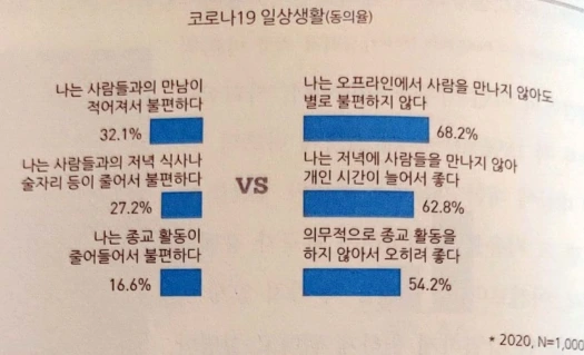 ‘나는 오프라인에서 사람을 만나지 않아도 별로 불편하지 않다’는 반응이 전체 중 68.2%를 차지했으며 ‘나는 사람들과의 만남이 적어져서 불편하다’는 응답은 불과 32.1%에 불과했다. 심지어 종교활동을 했던 사람들 중에서도 ‘나는 종교 활동이 줄어들어서 불편하다’는 응답은 16.6%에 불과했던 반면, ‘의무적으로 종교 활동을 하지 않아서 오히려 좋다’고 응답한 비율은 54.2%에 달하는 것을 볼 수 있다.