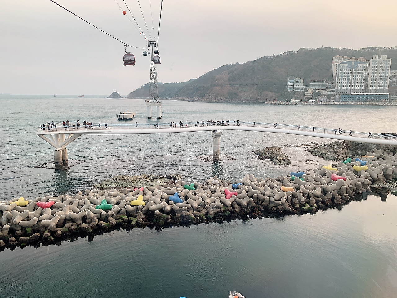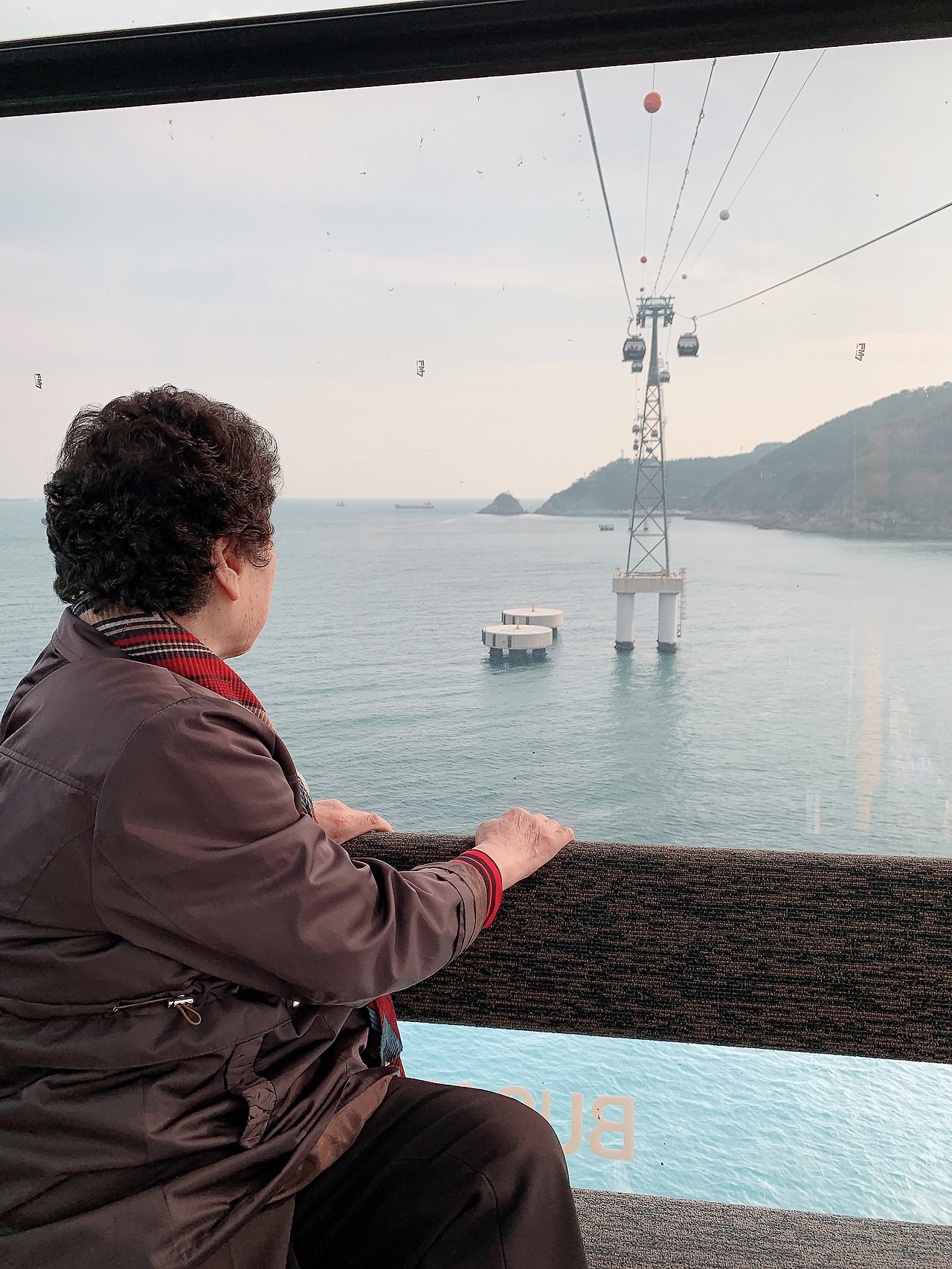 숙소에 도착하자마자 나와 아들은 해상케이블카를 타고 송도 바다를 가로지를 참여단을 모집했다. 다른 겁은 별로 없지만 유난히 놀이기구 겁이 많은 장모님과 아내가 기권했고, 아내와 연동되어 있는 둘째 아이가 덩달아 기권되었다. 발 밑으로 바다가 내려다보이는 케이블카라는 점이 더 한 몫을 한 것 같았다. 그렇게 해서 오후팀 참가자가 꾸려졌다. 용감하신 할머님, 처제, 나, 그리고 아들. 우리는 오랜만에 맑게 갠 하늘을 만끽하며 설레는 마음으로 표를 끊었다. 할머님 덕분에 덩달아 한 명까지 경로 할인을 받을 수 있었다.