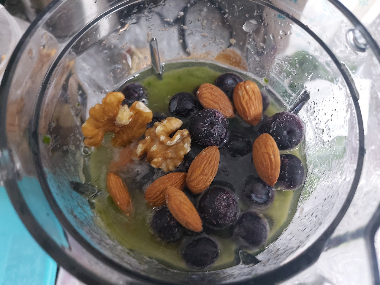 냉동실에 남겨져있는 거무튀튀한 바나나를 처리하는 날로 정했다. 오랫동안 쓰지 않은 믹서기를 꺼내본다.오아시스에서 구매한 케일과 냉동 블루베리, 견과류를 믹서기에 넣어 갈아낸다.