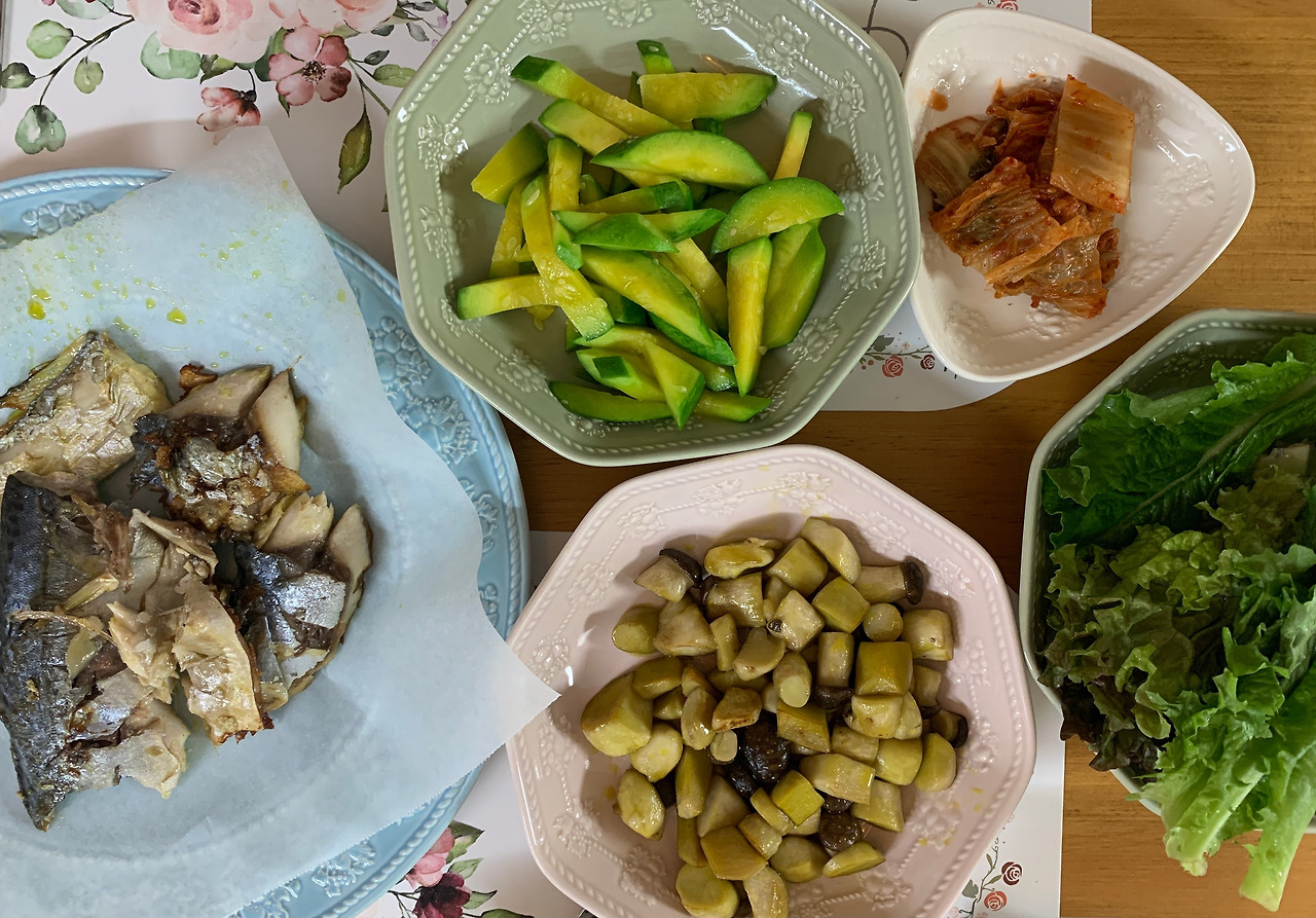 냉동 고등어를 해동해서 굽고, 애호박, 버섯을 볶아 쌈채소와 저녁상을 같이 차렸다. 같이 요리를 하고 상을 차리니 한결 재밌고 수월하더라.