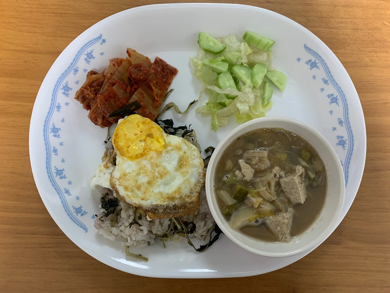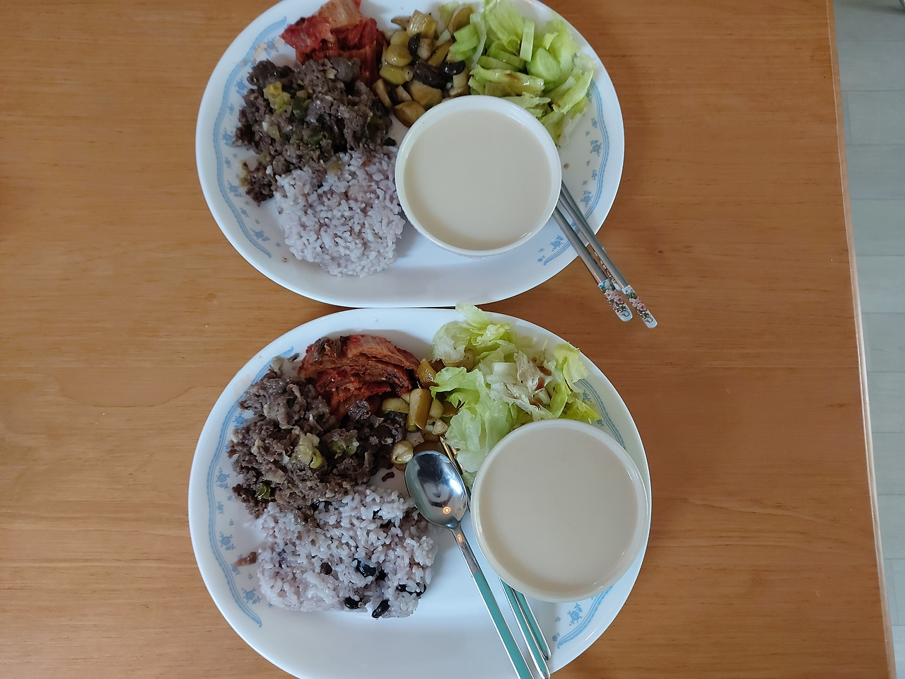 오아시스에서구매한 사골 국물로 국을 만든다. 전날 먹은 소불고기에 새송이버섯을 구워서 오이와 양상추 샐러드를 곁들인다. 이렇게 두 상을 차리고 한상은 거실에서 와이프가, 다른 한상은 방 안에서 내가 먹었다.